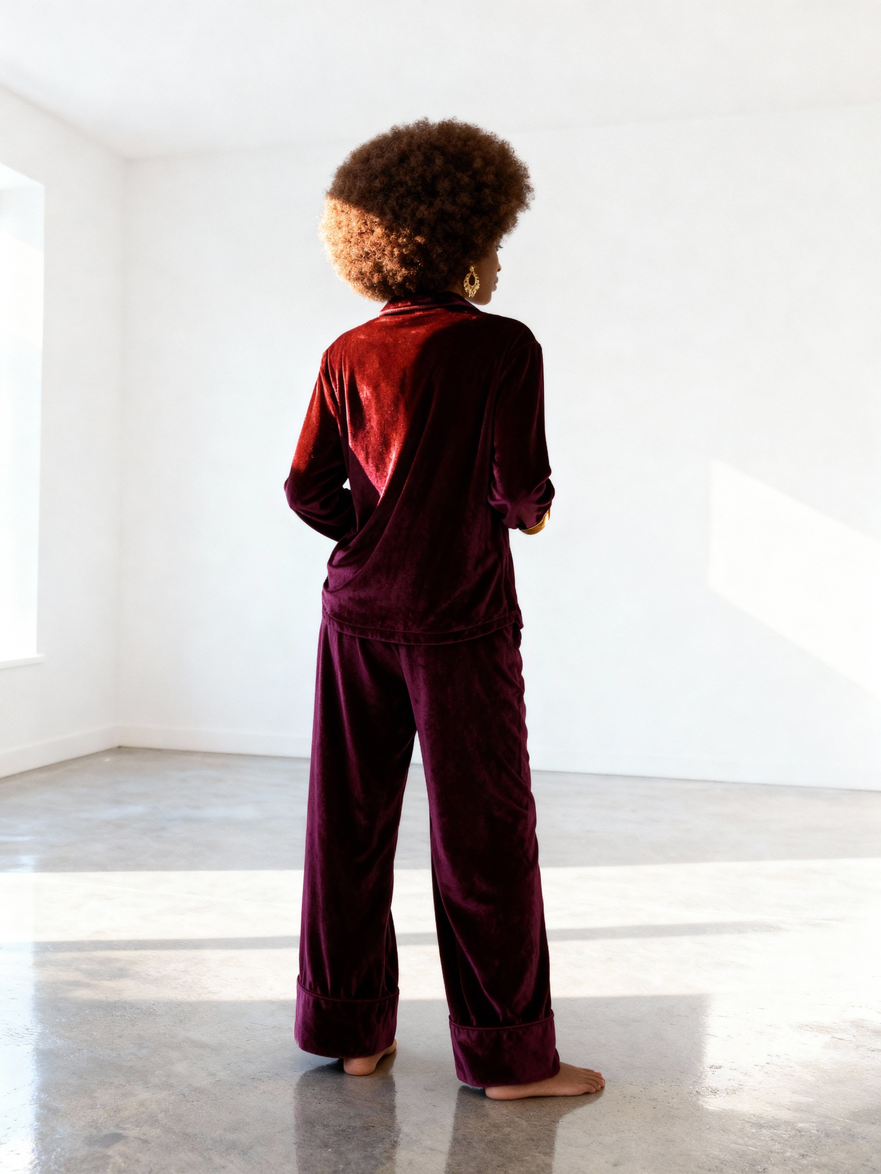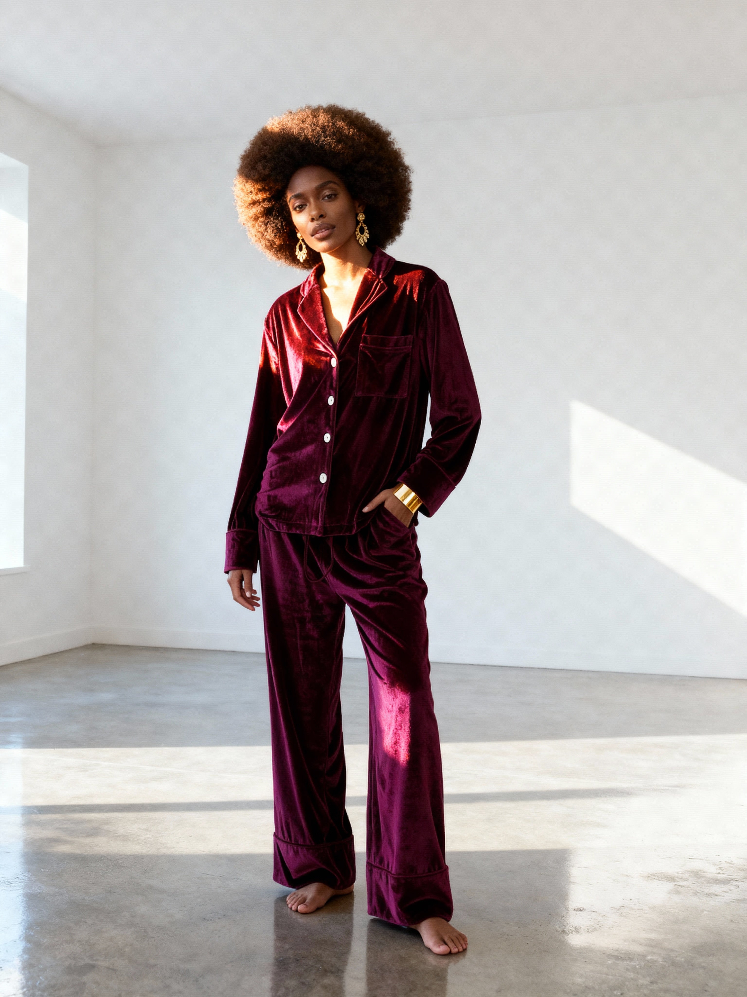 Crafted from plush, sumptuously soft velvet, this set wraps you in comfort while exuding effortless sophistication. The deep damson hue is perfect for autumn and winter, bringing a rich, seasonal touch to your loungewear collection.