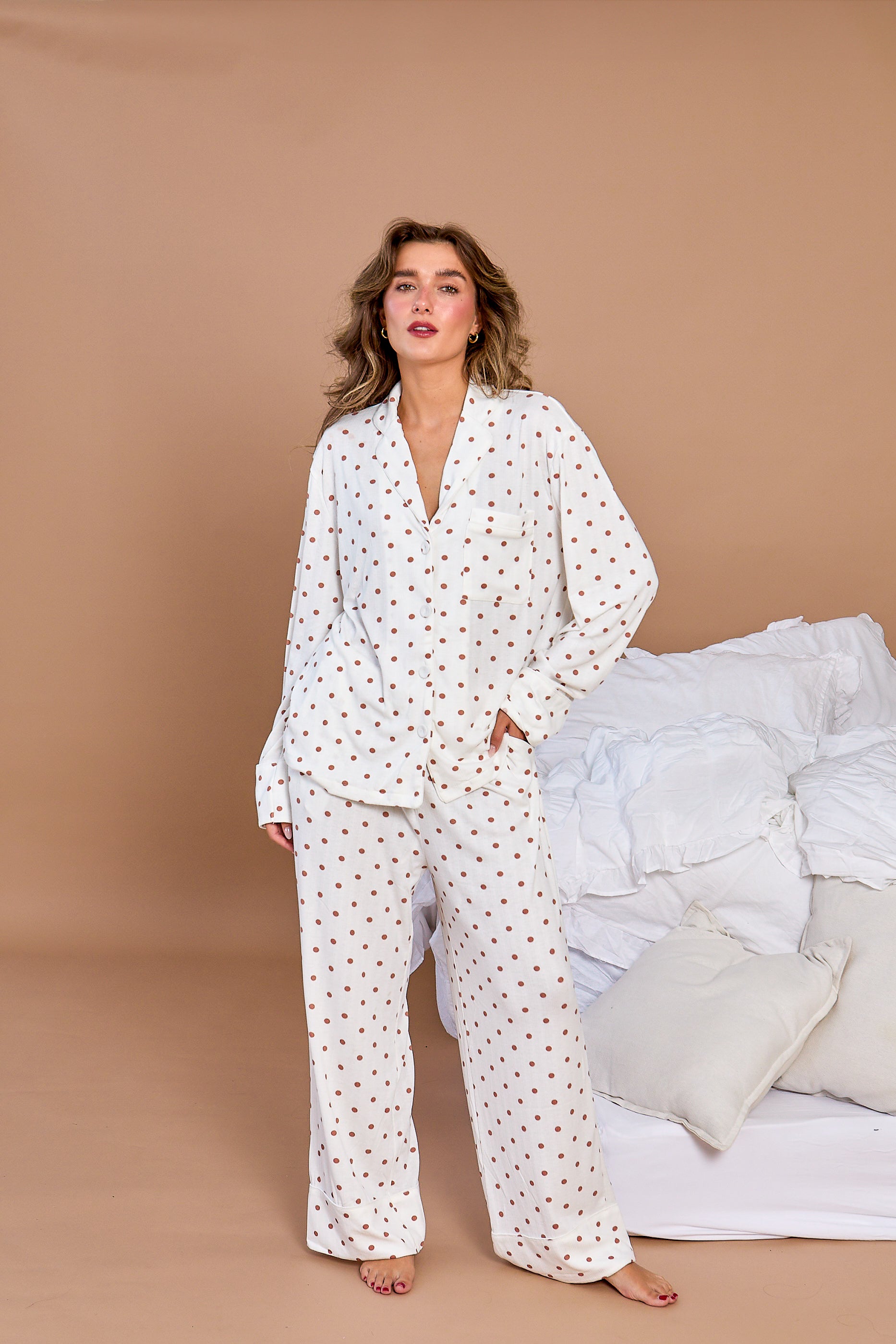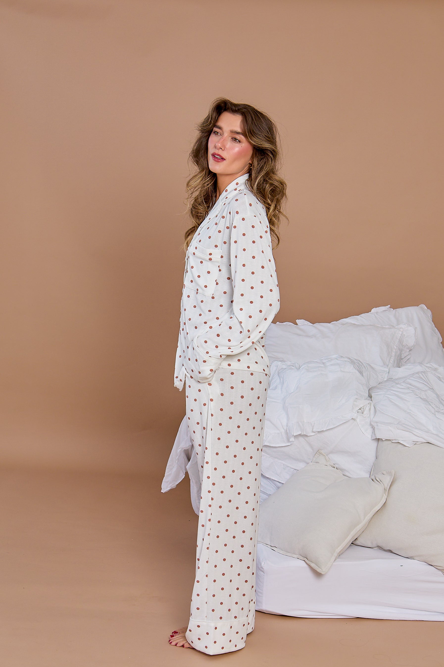 Elevate your loungewear with our Pointelle Polka Dot Trouser Set.