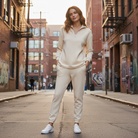 All of our styles are designed with a relaxed fit & elasticated, high-rise waist so stick with your usual size for best results. This set is designed with a jogger style cuffed bottom and a slouchy zipped funnel neck top.