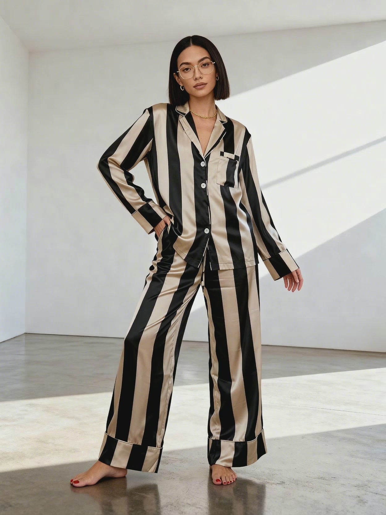Crafted from silky-smooth satin, this set drapes beautifully for a refined and polished look. The classic black hue paired with subtle stripes adds a modern, sophisticated touch, perfect for cooler evenings and stylish at-home lounging.