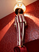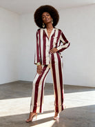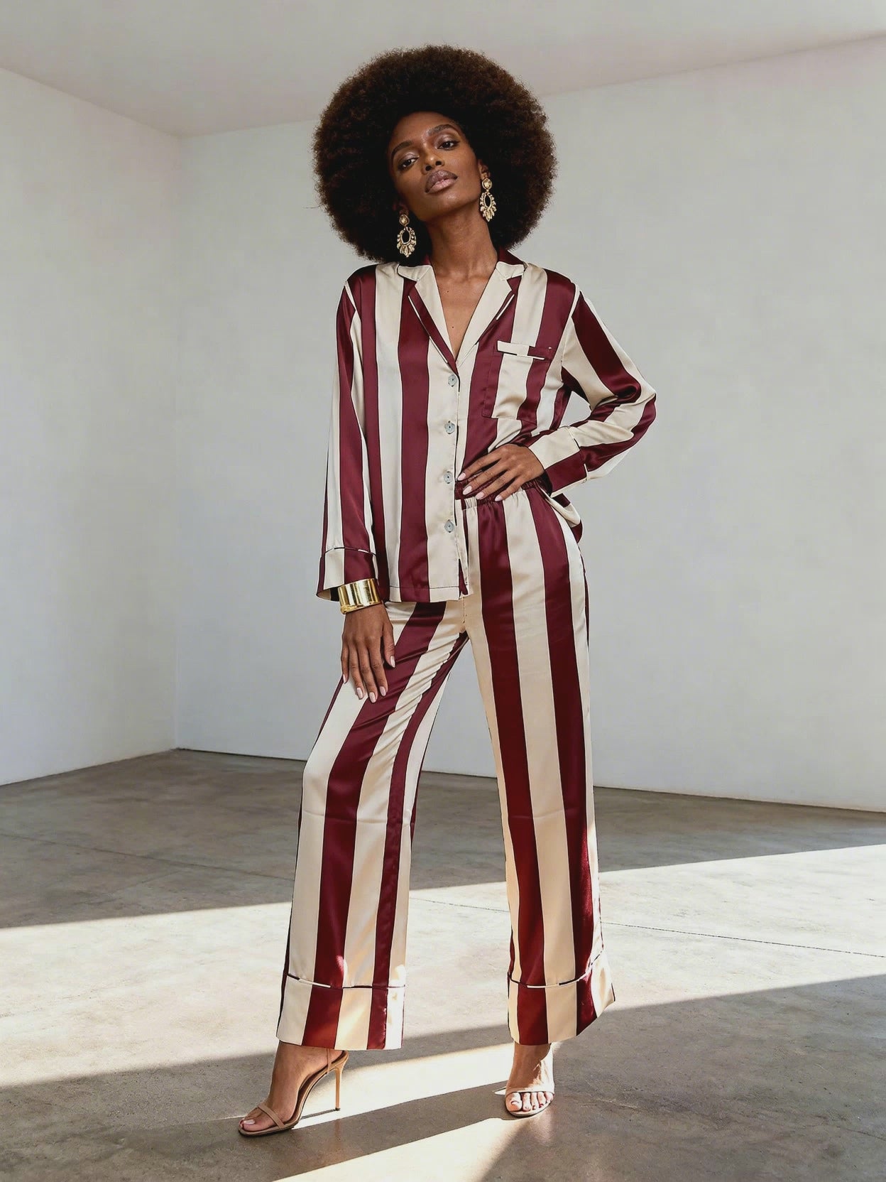 Lounge in refined elegance with our Burgundy Stripe Satin Trouser Set.