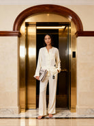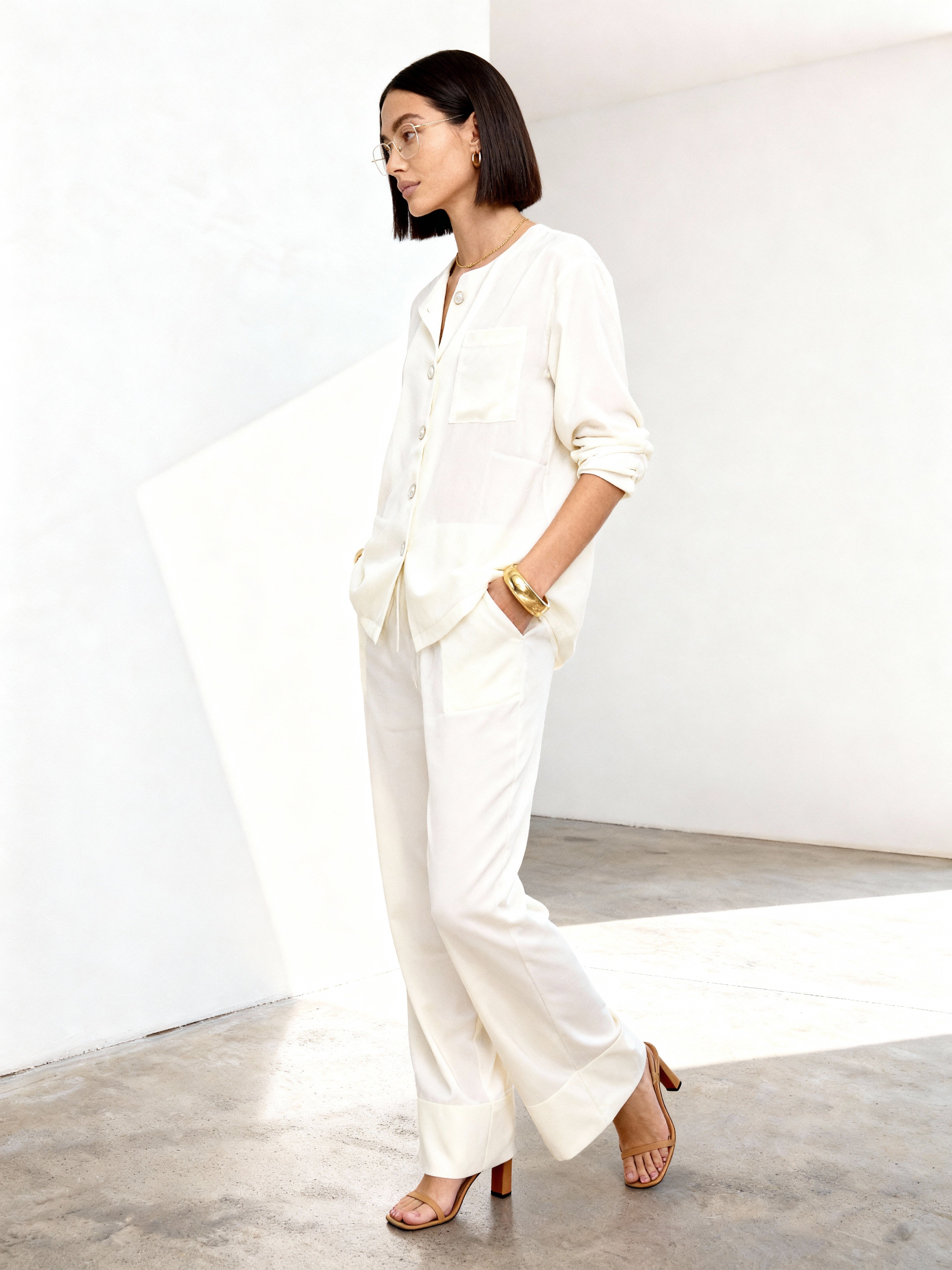 Elevate your loungewear with our Cream Collarless Satin Trouser Set.