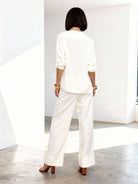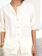 The modern collarless shirt pairs seamlessly with relaxed trousers featuring an elasticated waistband, offering a chic yet comfortable fit. Whether you’re unwinding at home or layering for a stylish at-home look, this set brings refined ease to every moment.