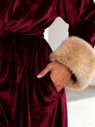 Crafted from sumptuously soft velvet fabric, this robe is designed to keep you warm and cozy on crisp autumn and winter evenings. The deep damson hue exudes rich, seasonal elegance, while the luxurious removable faux fur cuffs add a touch of glamour and tactile comfort.