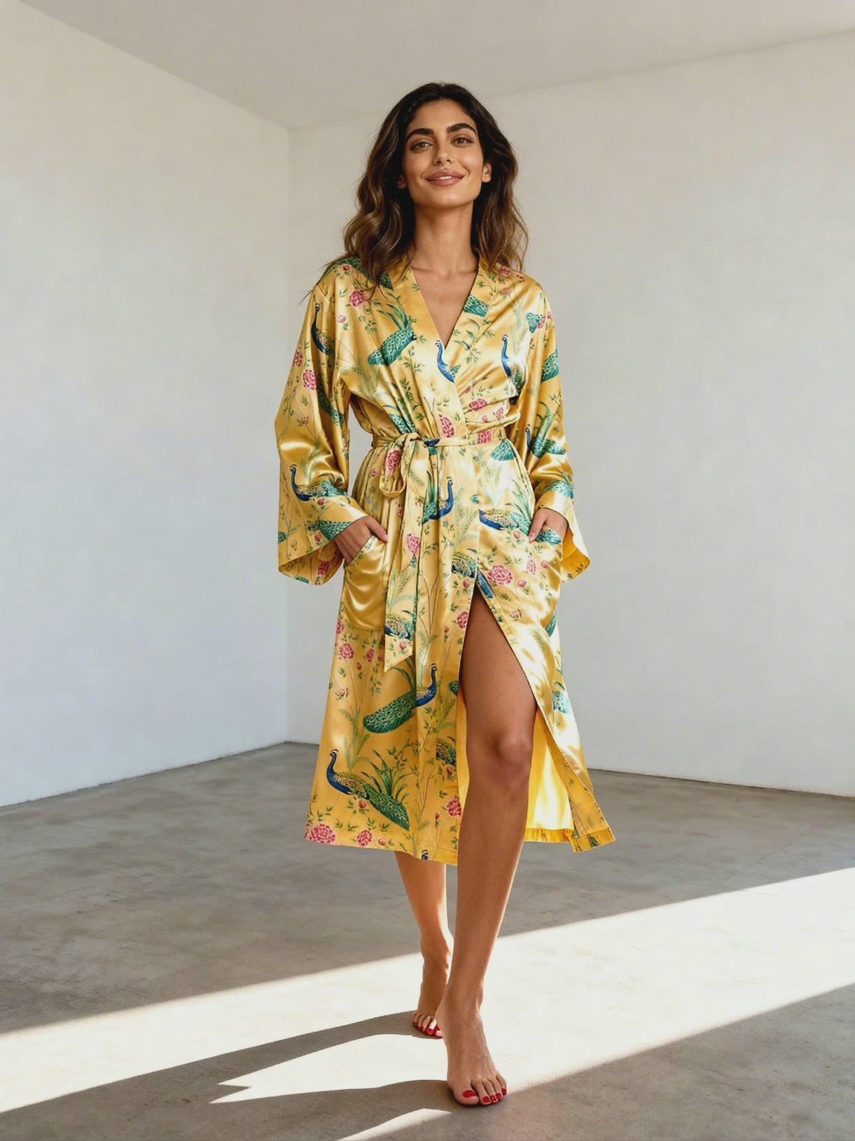 With its graceful drape and timeless silhouette, the Golden Peacock Robe is perfect for layering over your favourite sleepwear, or for indulging in a quiet moment of luxury on crisp autumn evenings.