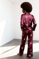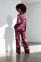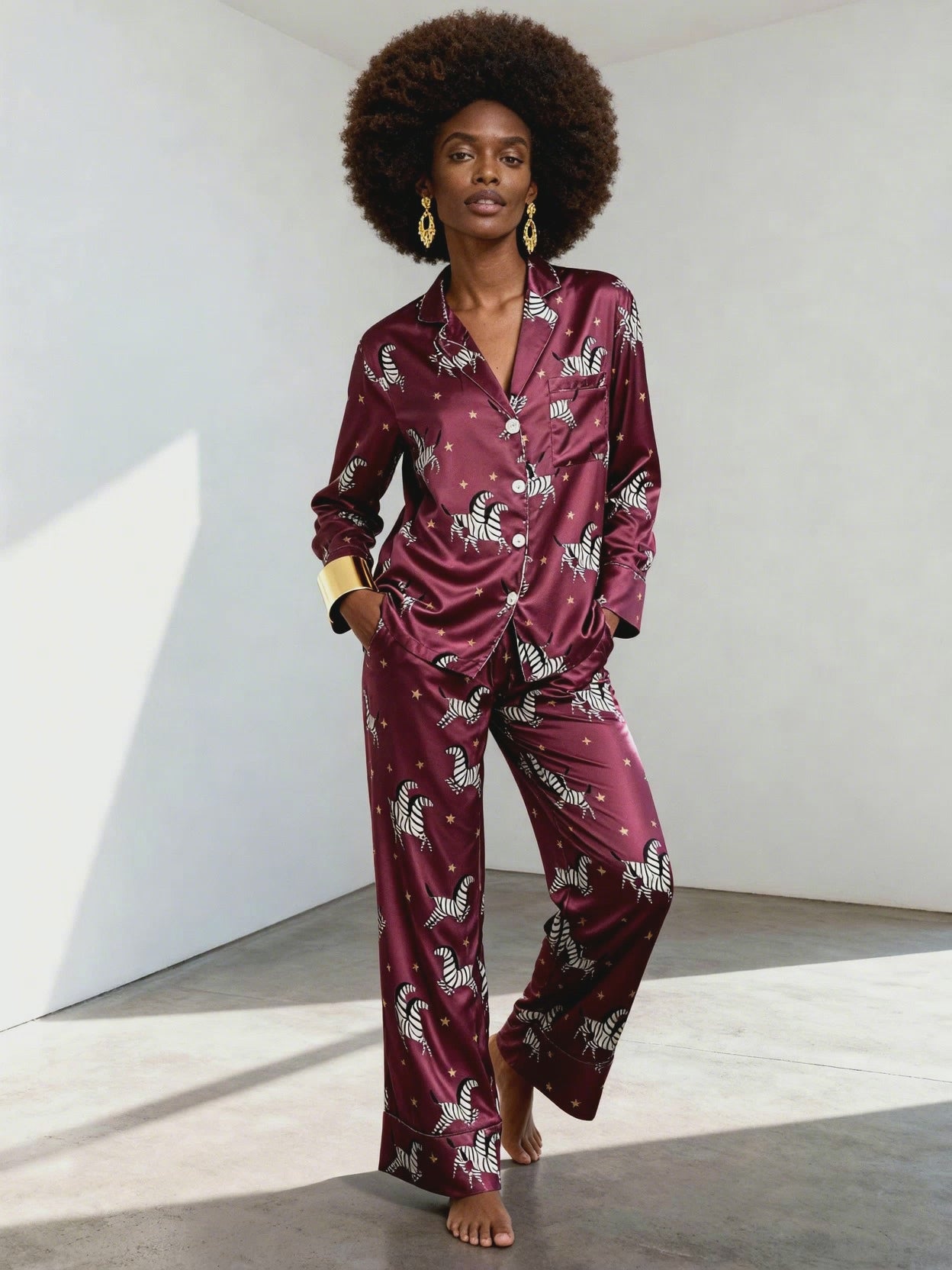 Crafted from buttery-soft silk satin, this set drapes elegantly for a luxurious, fluid fit. The hand-drawn zebra print brings a striking, artistic edge, while the deep purple hue adds a rich, sophisticated pop—perfect for autumn and winter evenings.