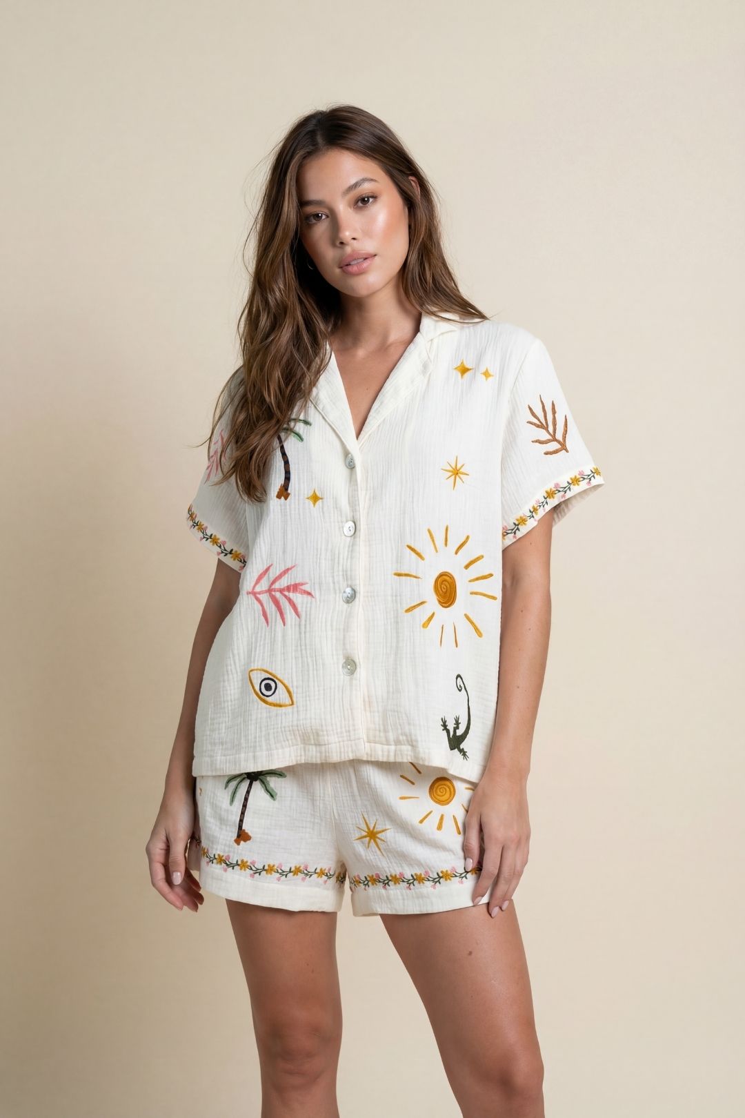 With a relaxed short-sleeve button-up and easy-fit shorts, it’s designed for warm days, golden hours, and everything in between.