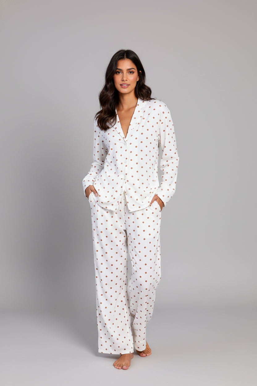 Made from soft, breathable pointelle fabric, this set is designed for comfort that feels effortlessly stylish. The timeless polka dot pattern adds a playful touch, while the subtle texture of the fabric brings depth and warmth—perfect for cooler mornings and relaxed evenings at home.