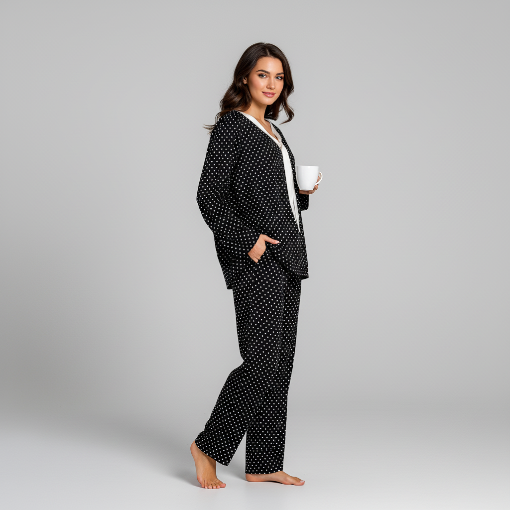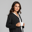 Crafted from buttery-soft silk satin, this set drapes beautifully against the skin, offering a touch of everyday luxury that feels indulgent yet effortless. The timeless polka dot print adds a playful charm, while the delicate tie details bring a feminine, elevated finish.