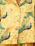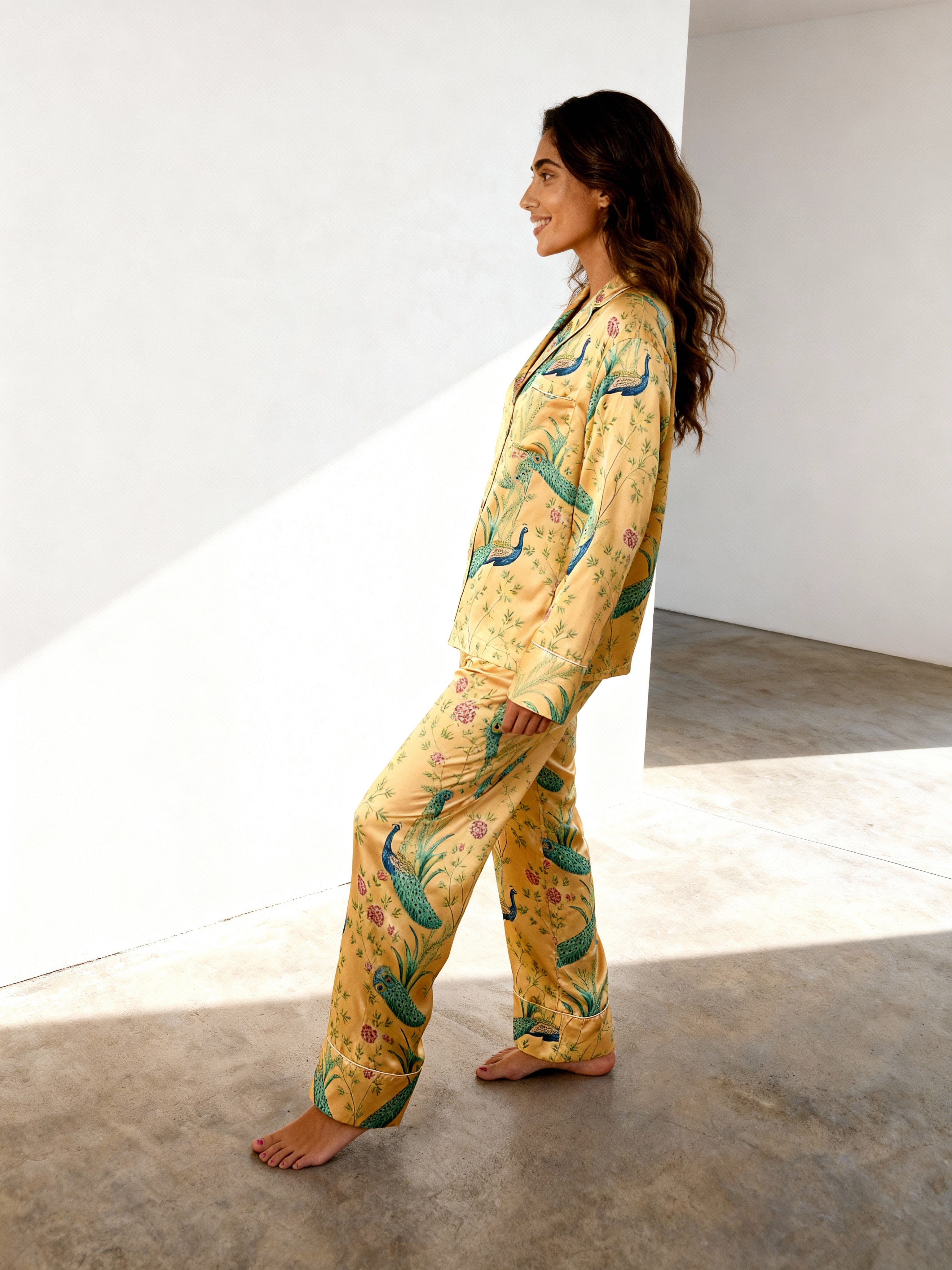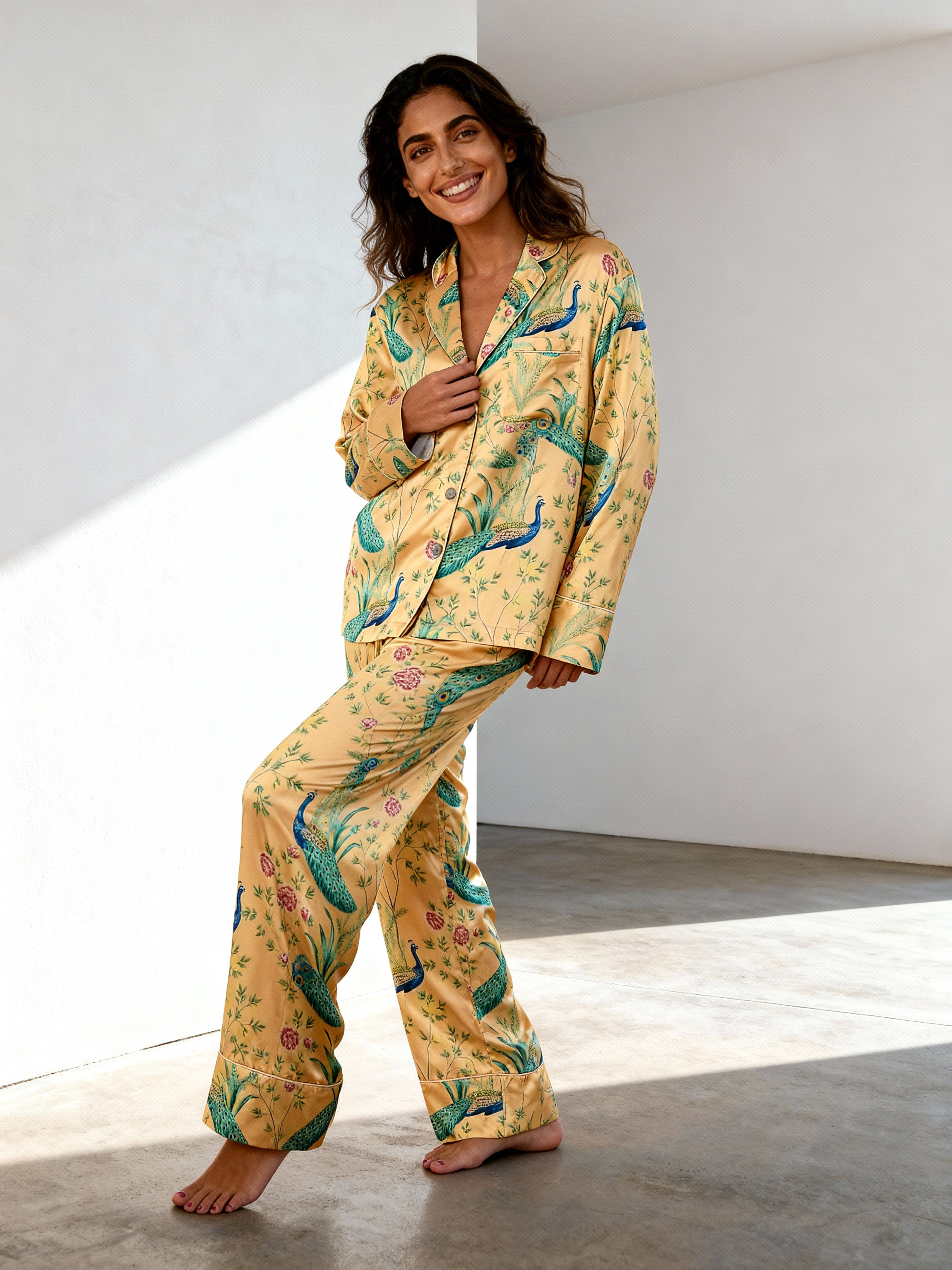 Crafted from smooth silk satin, this set feels indulgent against the skin while offering an elegant drape that moves with ease. The delicate hand-drawn oriental peacock design makes every piece feel like a work of art, blending timeless sophistication with a bold, statement finish.
