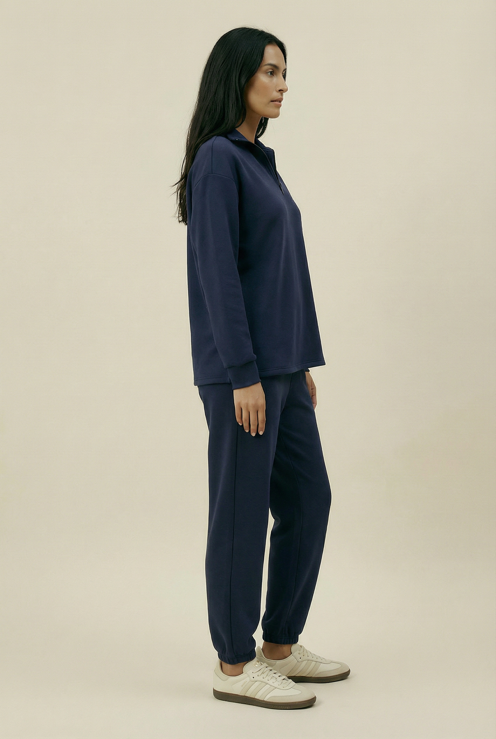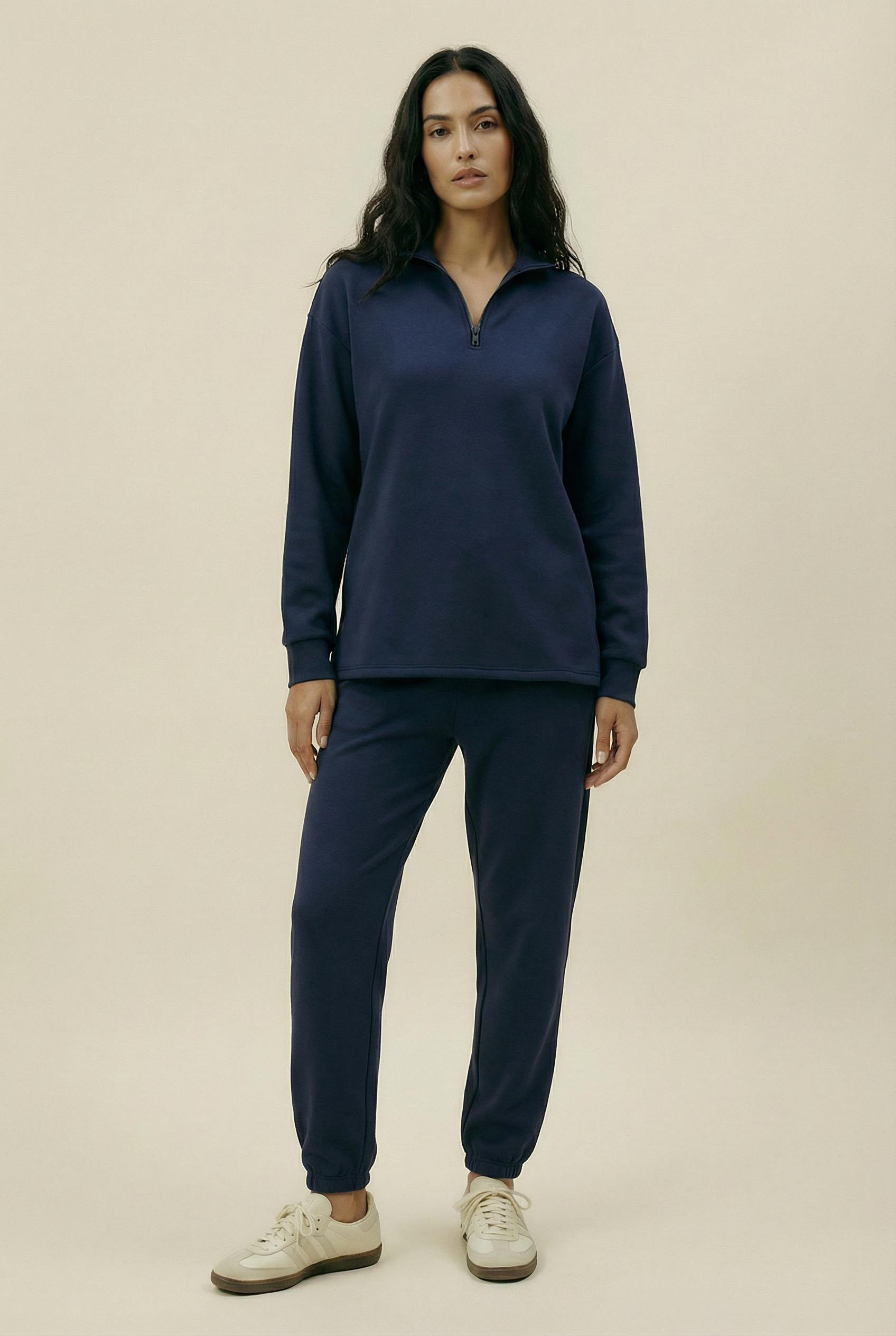 All of our styles are designed with a relaxed fit & elasticated, high-rise waist so stick with your usual size for best results. This set is designed with a jogger style cuffed bottom and a slouchy zipped funnel neck top.