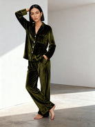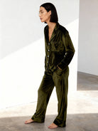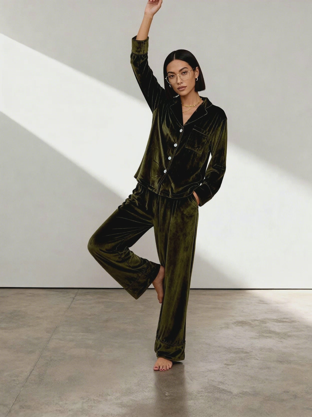 Cut from plush, decadent velvet, this set wraps you in warmth and softness - perfect for cooler evenings and cozy weekends. The deep olive tone adds a touch of understated luxury, making it a timeless staple for the colder seasons.